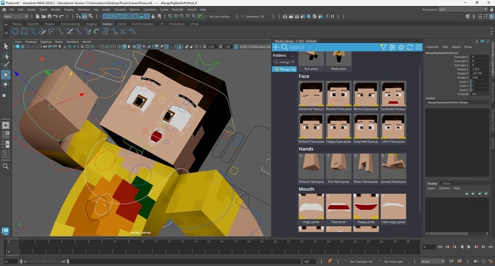 The included Pose Library features facial expressions, mouth shapes, hand poses, and a few animation cycles. It’s a common tool used to animate faster and stay on model.